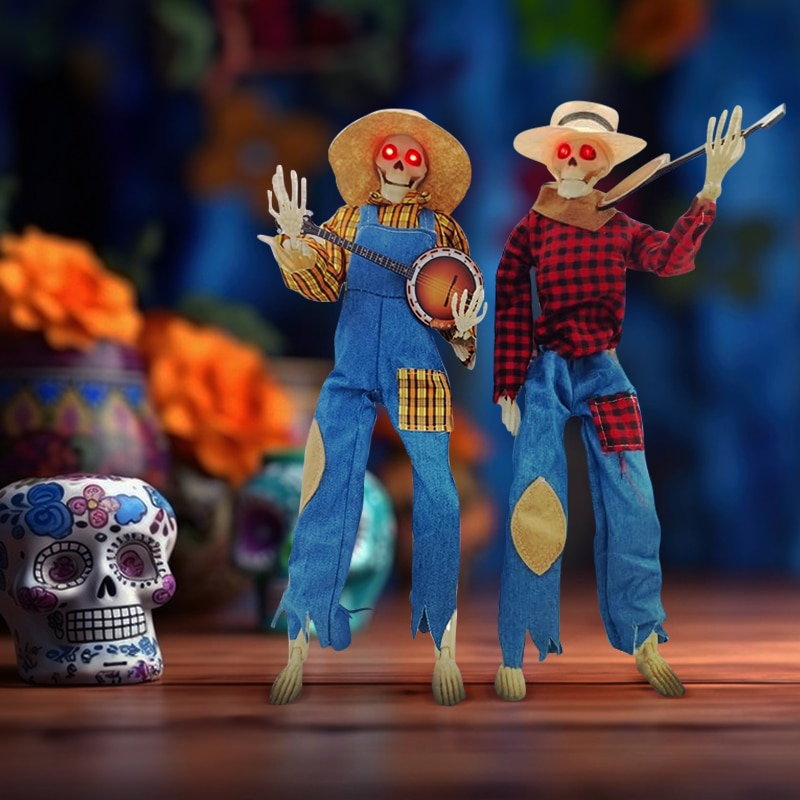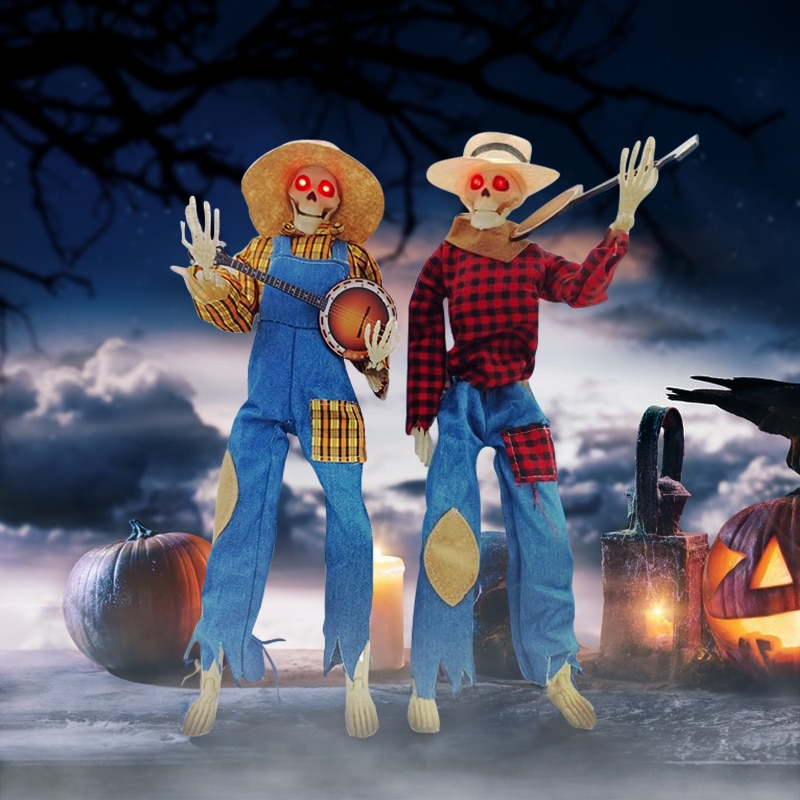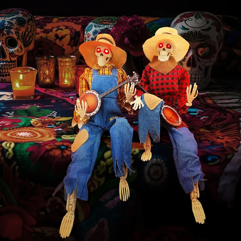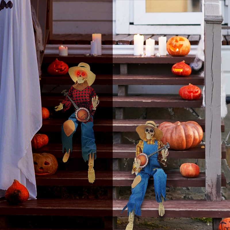 2. Unique Decor: This stands out as a distinctive and memorable Halloween decoration, combining the unexpected elements of a banjo and a skeleton.