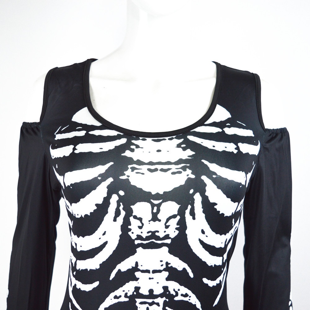Embrace the Halloween spirit with this Skull Skeleton Printed Sexy Off-the-shoulder Costume. Designed for a striking look, it features an off-the-shoulder cut that adds a touch of allure while showcasing the bold skeleton print for a spooky vibe. Perfect for costume parties or themed events, this outfit combines comfort with eye-catching style, ensuring you stand out with confidence and flair.